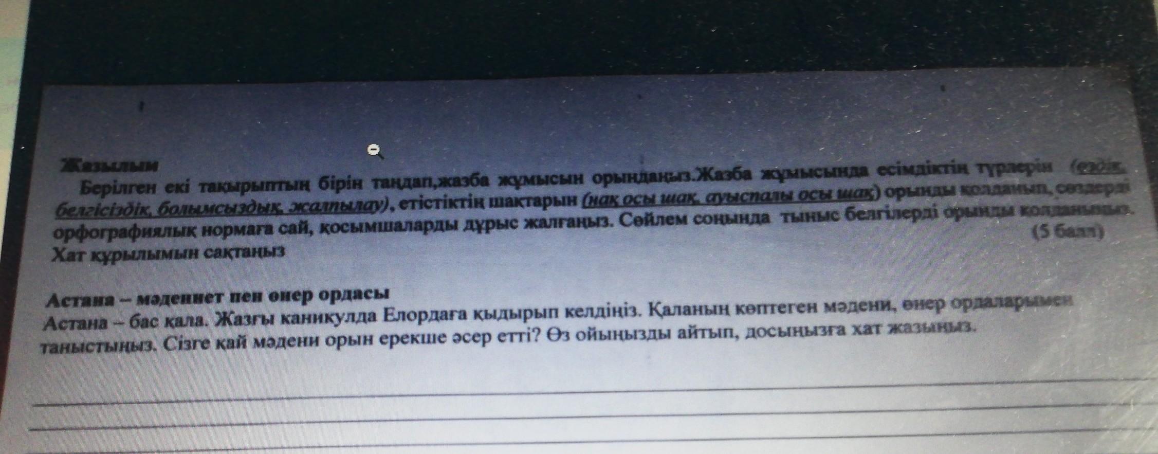 Жазылым Берілген екі тақырыптың бірін таңдап, жазба жұмысын орындаңыз.Жазба жұмысында есімдіктің түрлерін едік, белгісіздік, болымсыздык, жалпылау, етістіктің шақтарын (нақ осы шақ, ауыспалы осы шақ) орынды қолданып, сөздерді орфографиялық нормаға сай, қосымшаларды дұрыс жалғаңыз. Сөйлем соңында тыныс белгілерді орынды қолданыңыз. Хат құрылымын сақтаңыз (5 балл) Астана – мәдениет пен өнер ордасы Астана - бас қала. Жазгы каникулда Елордаға қыдырып келдіңіз. Қаланың көптеген мәдени, өнер ордаларымен таныстыңыз. Сізге қай мәдени орын ерекше әсер етті? Өз ойыңызды айтып, досыңызга хат жазыңыз.
