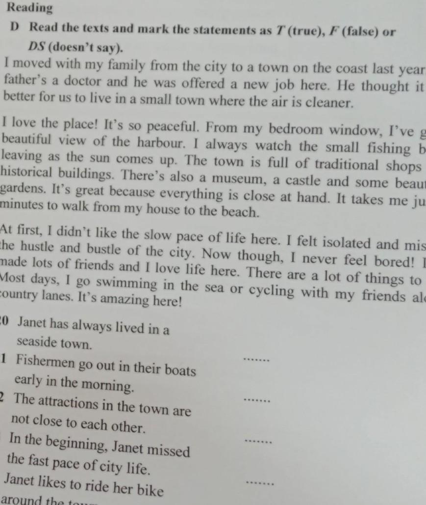 Reading D Read the texts and mark the statements as T (true), F (false) or DS (doesn't say). I moved with my family from the city to a town on the coast last year. My father's a doctor and he was offered a new job here. He thought it was better for us to live in a small town where the air is cleaner. I love the place! It's so peaceful. From my bedroom window, I've got a beautiful view of the harbour. I always watch the small fishing boats leaving as the sun comes up. The town is full of traditional shops and historical buildings. There's also a museum, a castle and some beautiful gardens. It's great because everything is close at hand. It takes me just 5 minutes to walk from my house to the beach. At first, I didn't like the slow pace of life here. I felt isolated and missed the hustle and bustle of the city. Now though, I never feel bored! I've made lots of friends and I love life here. There are a lot of things to do. Most days, I go swimming in the sea or cycling with my friends along country lanes. It's amazing here! 20 Janet has always lived in a seaside town. 21 Fishermen go out in their boats early in the morning. 22 The attractions in the town are not close to each other. 23 In the beginning, Janet missed the fast pace of city life. 24 Janet likes to ride her bike around the town.
