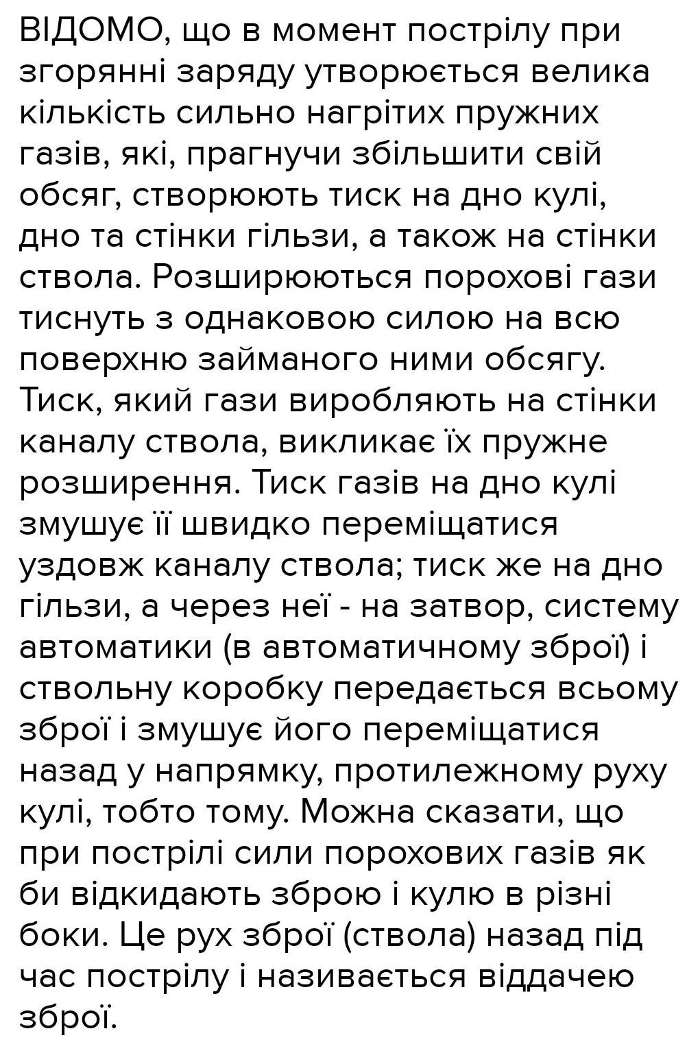 ВІДОМО, що в момент пострілу при згорянні заряду утворюється велика кількість сильно нагрітих пружних газів, які, прагнучи збільшити свій обсяг, створюють тиск на дно кулі, дно та стінки гільзи, а також на стінки ствола. Розширюються порохові гази тиснуть з однаковою силою на всю поверхню займаного ними обсягу. Тиск, який гази виробляють на стінки каналу ствола, викликає їх пружне розширення. Тиск газів на дно кулі змушує її швидко переміщатися уздовж каналу ствола; тиск же на дно гільзи, а через неї - на затвор, систему автоматики (в автоматичному зброї) і ствольну коробку передається всьому зброї і змушує його переміщатися назад у напрямку, протилежному руху кулі, тобто тому. Можна сказати, що при пострілі сили порохових газів як би відкидають зброю і кулю в різні боки. Це рух зброї (ствола) назад під час пострілу і називається віддачею зброї.
