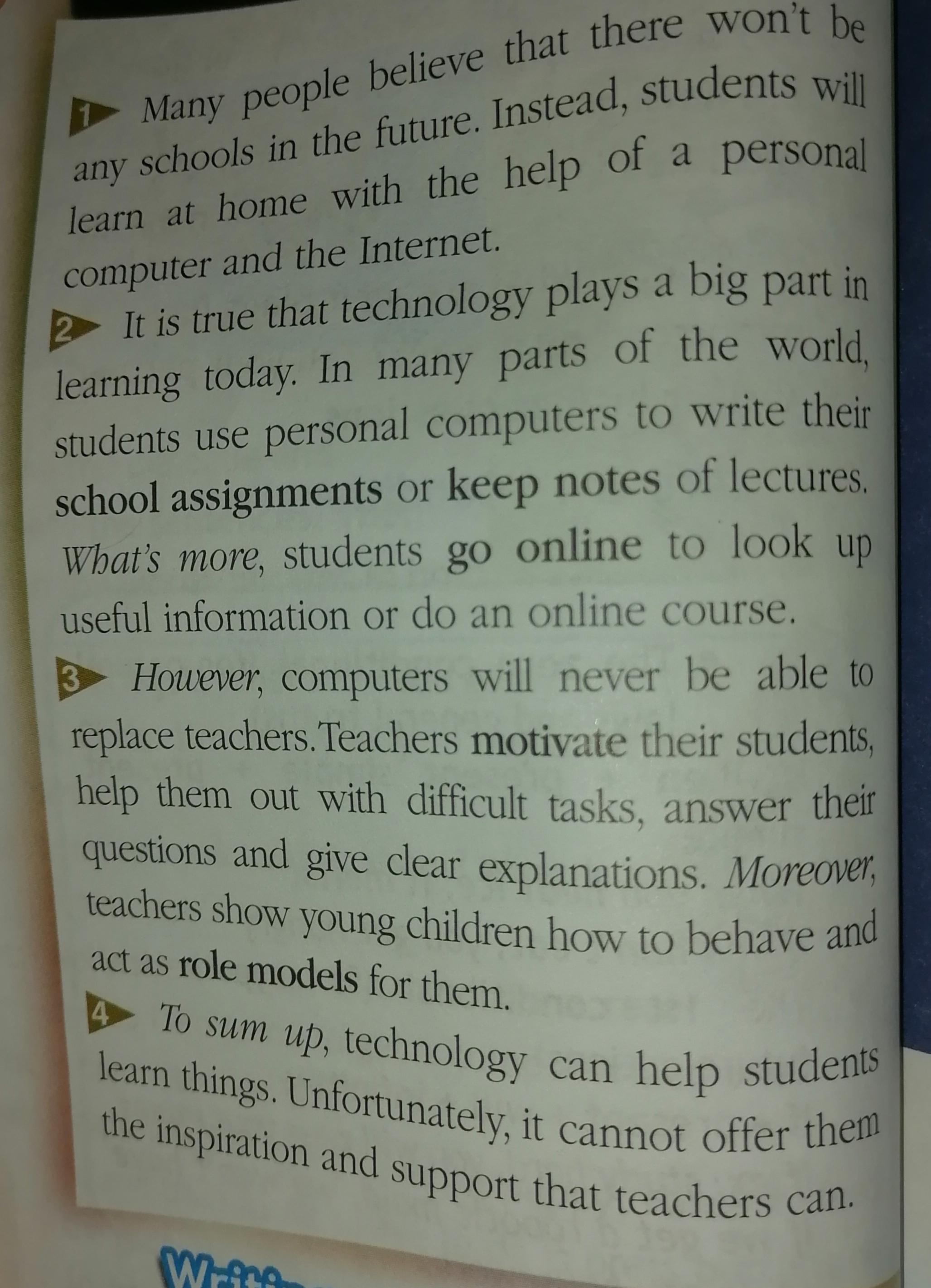 Хауэвэр, компьютэрс уыл нэва би эйбл ту риплэйс тичерс. Тичерс мотивэйт зэир стьюдэнтс, хэлп зэм аут выз диффикалт таскс, ансуэр зэир квэсчонс энд гив клиар эксплэнэйшонс. Моровэр, тичерс шоу янг чилдрэн хау ту бихейв энд экт эз роул модэлс фор зэм.