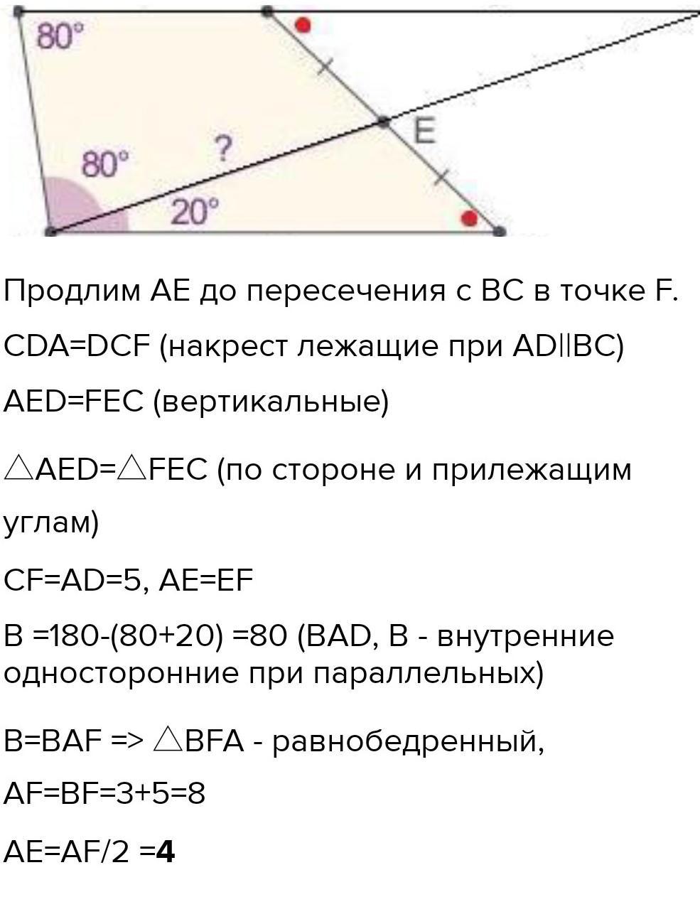 В трапеции ABCD с основаниями AD и ВС (а и b соответственно) , точка Е – середина боковой стороны CD, причем угол EAD равен 40º, а угол BAE равен 70º. Докажите, что отрезок АЕ равен 1/2(a+b)
