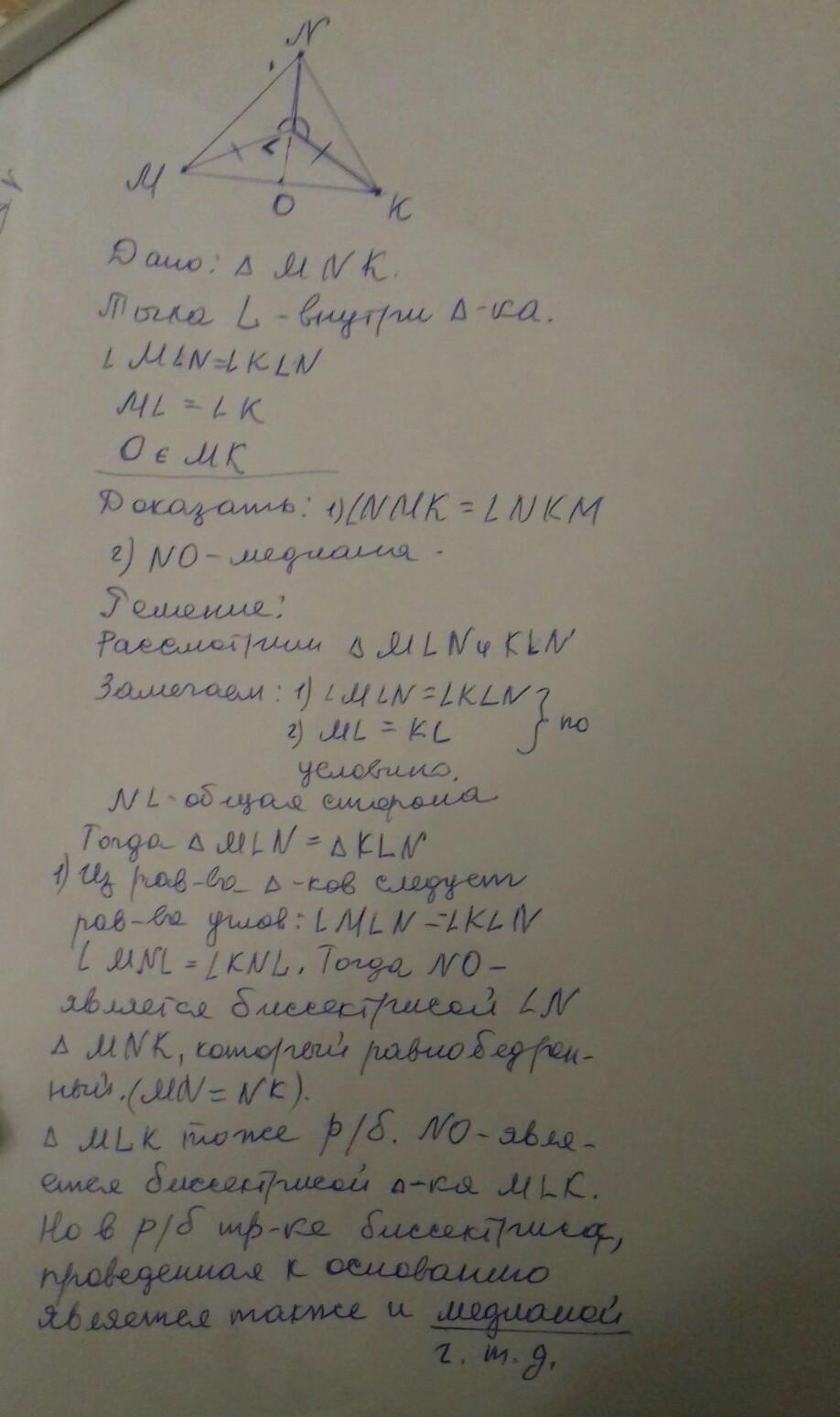 Внутри треугольника MNK отметили точку L так, что угол MLN = уголу KLN и