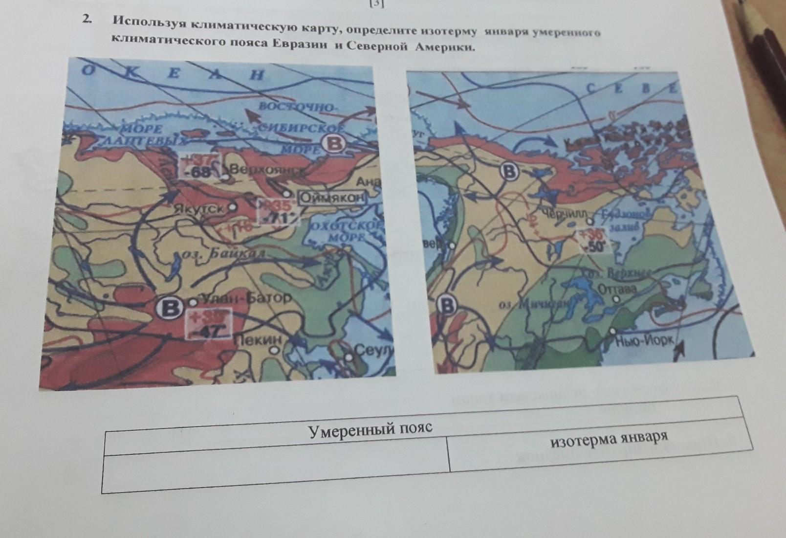 Используя климатическую карту, определите изотерму января умеренного климатического пояса Евразии и Северной Америки.
