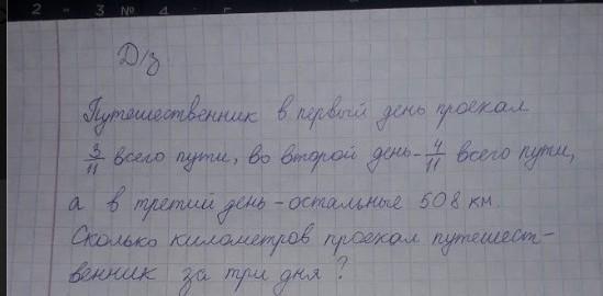 508 : 4/11 = 508 : 4 * 11= 1397 км проехал путешественник за 3 дня