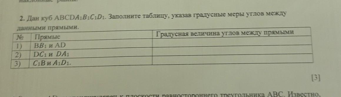 2. Дан куб ABCDA1B1C1D1. Заполните таблицу, указав градусные меры углов между данными прямыми. тусная на углов между прямыми