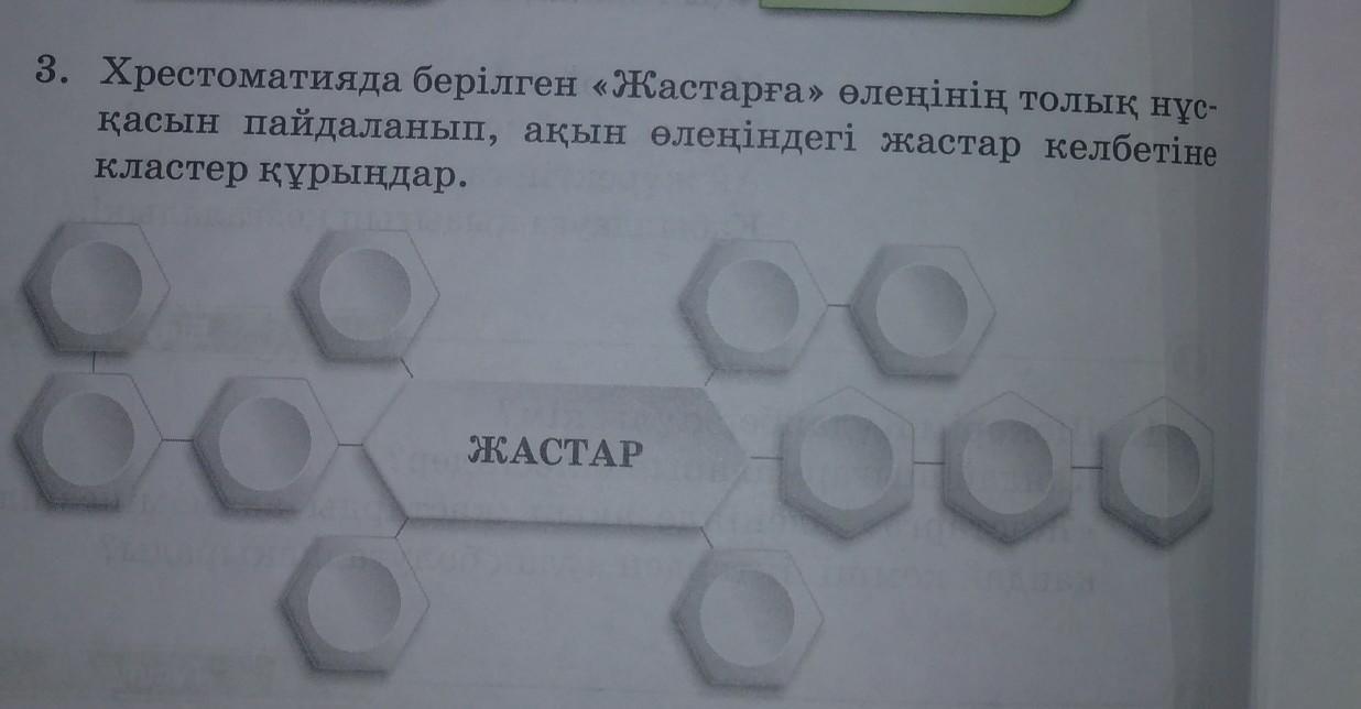 3. Хрестоматияда берілген «Жастарға» өлеңінің толық нұс- қасын пайдаланып, ақын өлеңіндегі жастар келбетіне кластер құрыңдар.