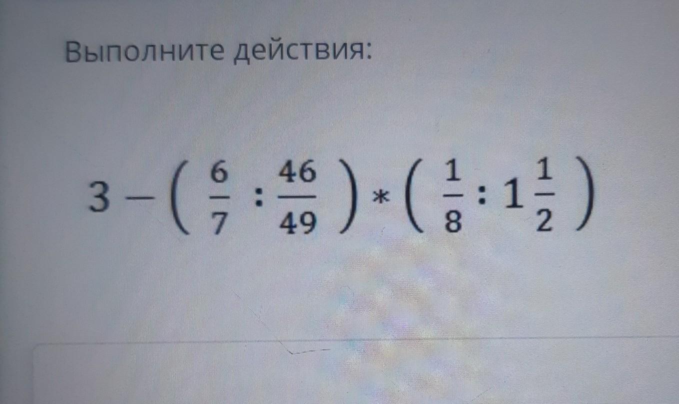 3-(6/7:46/49)*(1/8:1 1/2)= 3*21/23*(1/4*1/3)=3 21/23*1/12=21/23*1/4=21/92