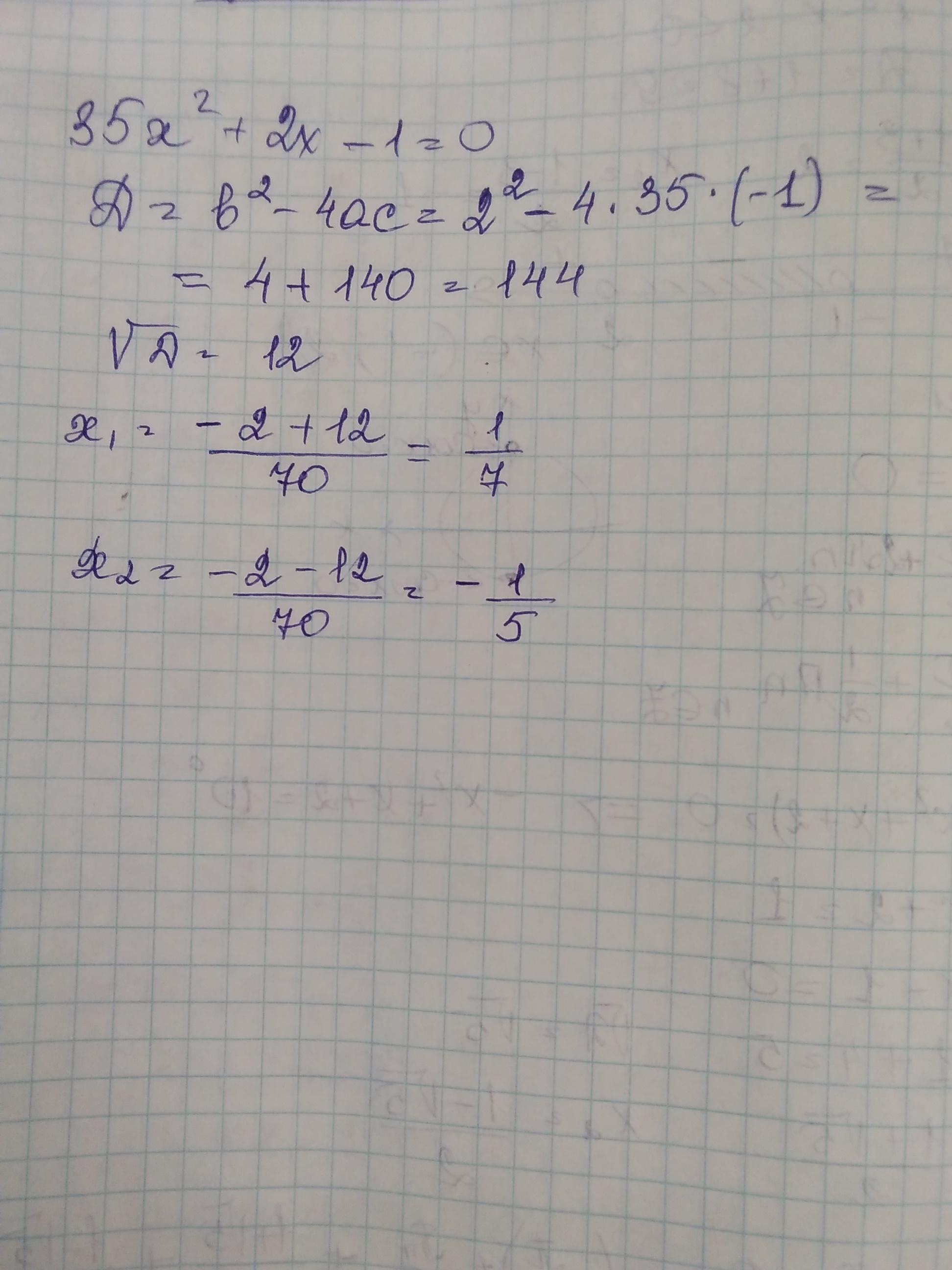 Найдите корни уравнения через дискриминант: 35х2 + 2x – 1= 0;