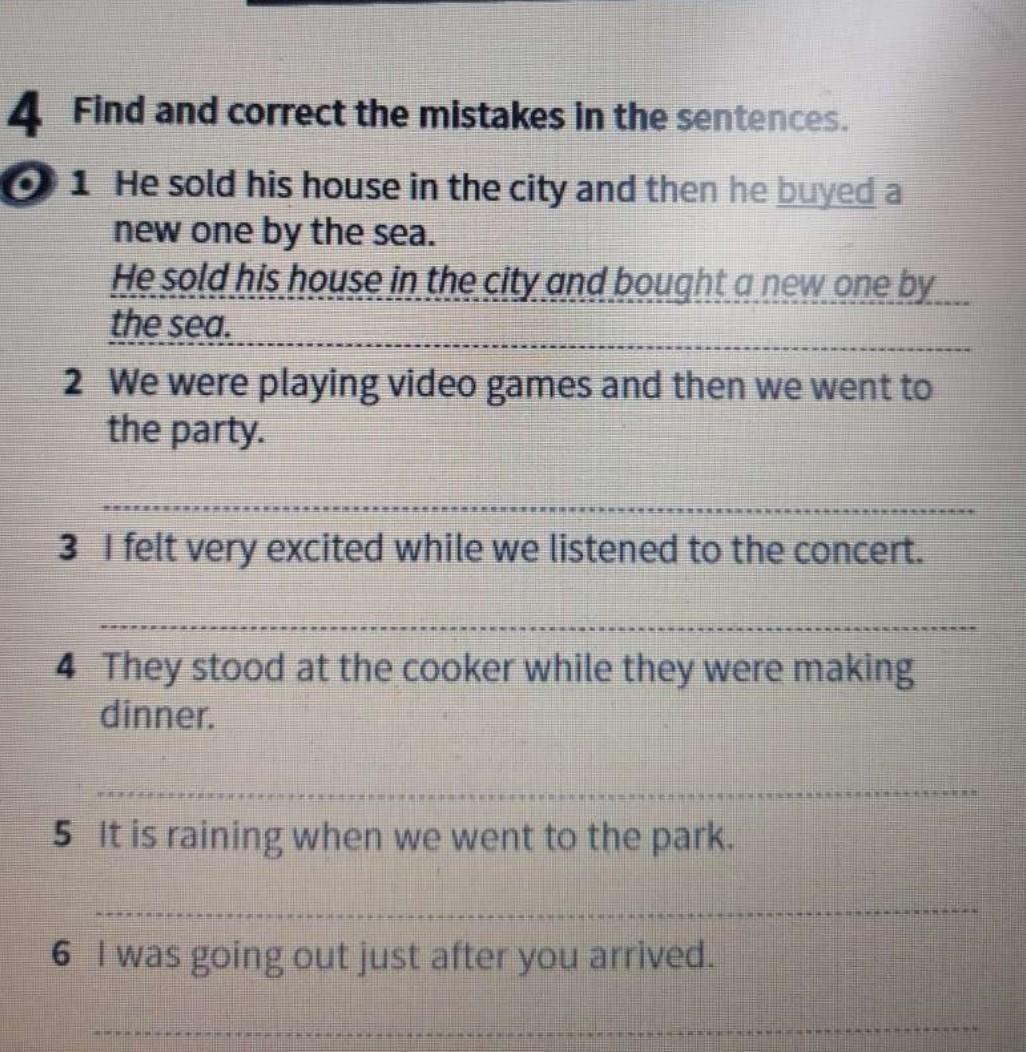 2.We played video games and then we went to the party. 3.I felt very excited while we were listening to the concert. 4.They were standing at the cooker while they were making dinner. 5.It was raining when we went to the park 6. I went out just after you arrived.
