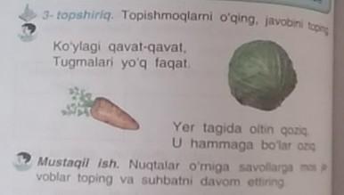 3- topshiriq. Topishmoqlarni o'qing, javobini toping Ko'ylagi qavat-qavat, Tugmalari yoʻq faqat. Yer tagida oltin qoziq, U hammaga bo'lar oziq. Mustaqil