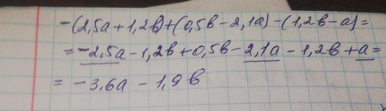 3. Раскройте скобки и приведите подобные слагаемые – (2,5a + 1,2b) + (0,5b – 2,1a) – (1,2b – a) срочноо!!!!! Дам 50 балов