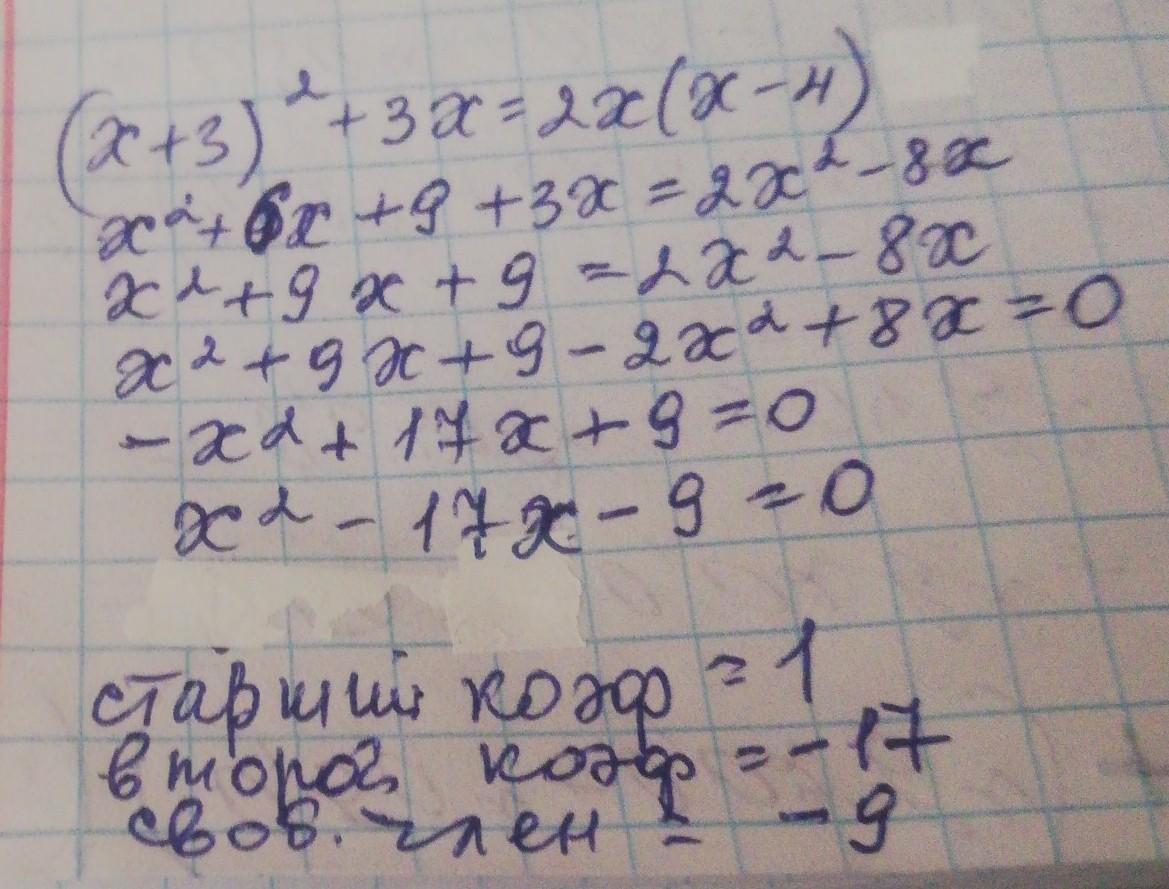 Преобразуйте уравнение (х+3)^2+3х=2х(х-4)к виду ax^2+bx+c=0 и укажите старший коэффициент, второй коэффициент и свободный член.