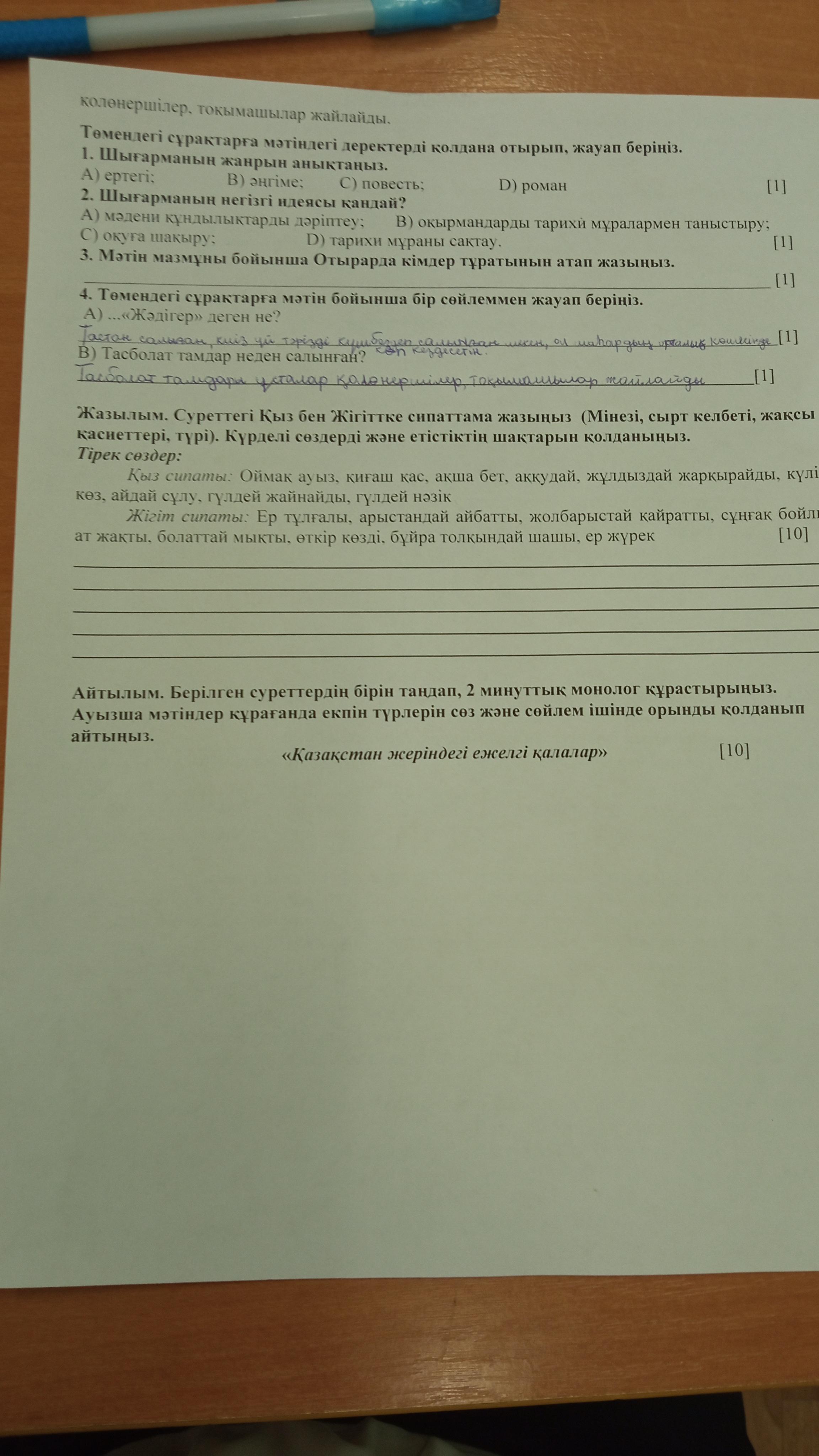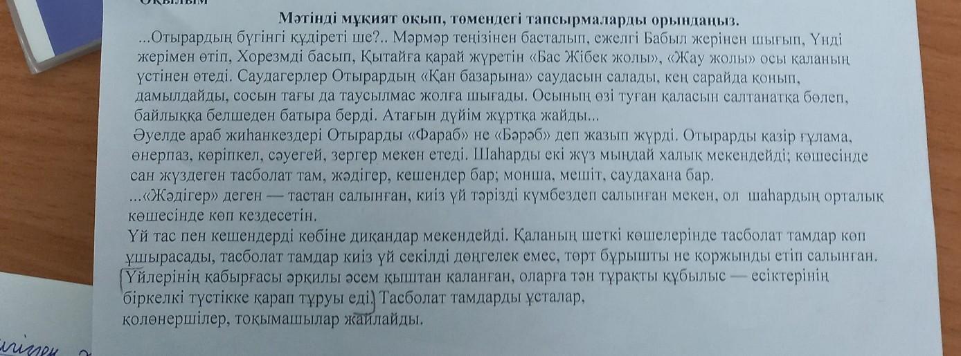 Төмендегі сұрақтарға мәтіндегі деректерді қолдана отырып, жауап беріңіз. 1. Шығарманың жанрын анықтаңыз. A) ертегі В) әңгіме C) повесть D) роман [1] 2. Шығарманың негізгі идеясы қандай? А) мәдени құндылықтарды дәріптеу В) оқырмандарды тарихи мұралармен таныстыру C) оқуға шақыру D) тарихи мұраны сақтау [1] 3. Мәтін мазмұны бойынша Отырарда кімдер тұратынын атап жазыңыз. [1] 4. Төмендегі сұрақтарға мәтін бойынша бір сөйлеммен жауап беріңіз. А) ...«Жәдігер» деген не? [1] В) Тасболат тамдар неден салынған? [1] 1/4 Г107
