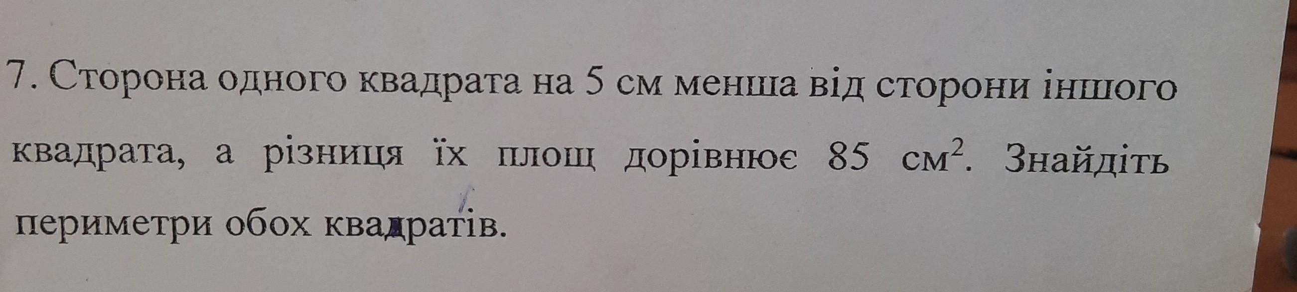 7. Сторона одного квадрата на 5 см менша від сторони іншого квадрата, а різниця їх площ дорівнює 85 см. Знайдіть периметри обох квадратів.