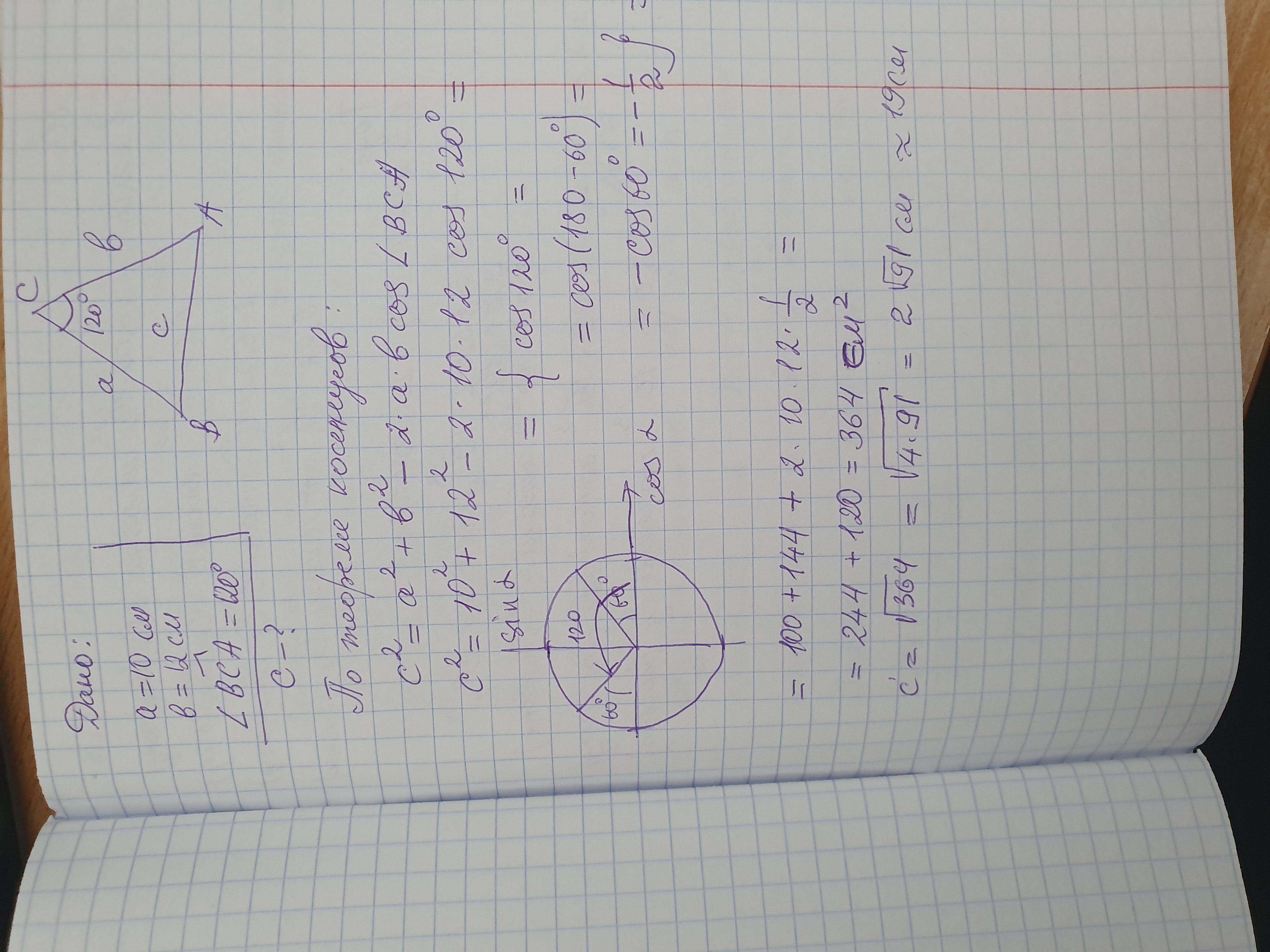 Дві сторони трикутника дорівнюють 10 і 12см, а кут між ними 120°. Знайдіть невідому сторону трикутника