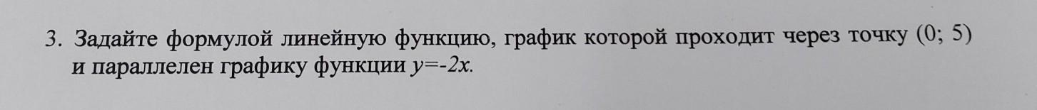 3. Задайте формулой линейную функцию, график которой проходит через точку (0;5) и параллелен графику функции y = - 2x