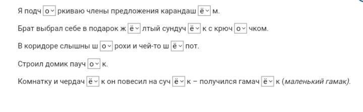 Я подч о ркиваю члены предложения карандаш ё м. Брат выбрал себе в подарок ж ё лтый сундуч ё к с крюч о чком. В коридоре слышны ш о рохи и чей-то ш ё пот. Строил домик пауч 0 к. Комнатку и чердач ё к он повесил на суч ё к - получился гамач ё к (маленький гамак).