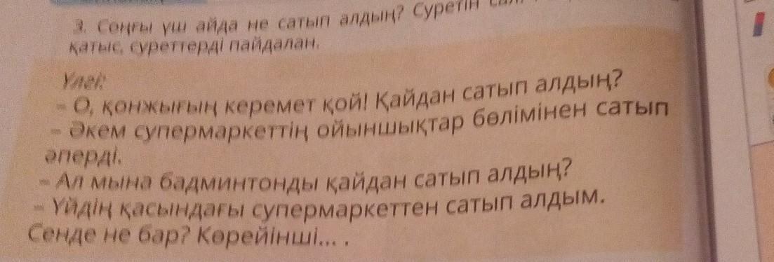 Ойнайық 3. Соңғы үш айда не сатып алдың? Суретін сал. Рөлдік ойынға қатыс, суреттерді пайдалан. Үлгі: - S, қонжығың керемет қой! Қайдан сатып алдың? Әкем супермаркеттің ойыншықтар бөлімінен сатып әперді. - Ал мына бадминтонды қайдан сатып алдың? - Үйдің қасындағы супермаркеттен сатып алдым. Сенде не бар? Көрейінші... .Пж срочно помогите