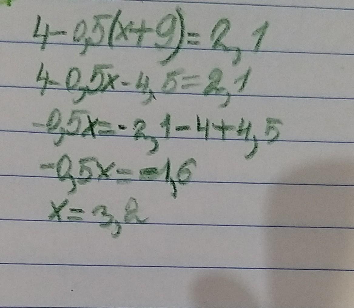 4-0,5(х+9)=-2,1 4-0,5х-4,5=-2,1 -0,5х=-2,1-4+4,5 -0,5х=-1,6 х=3,2