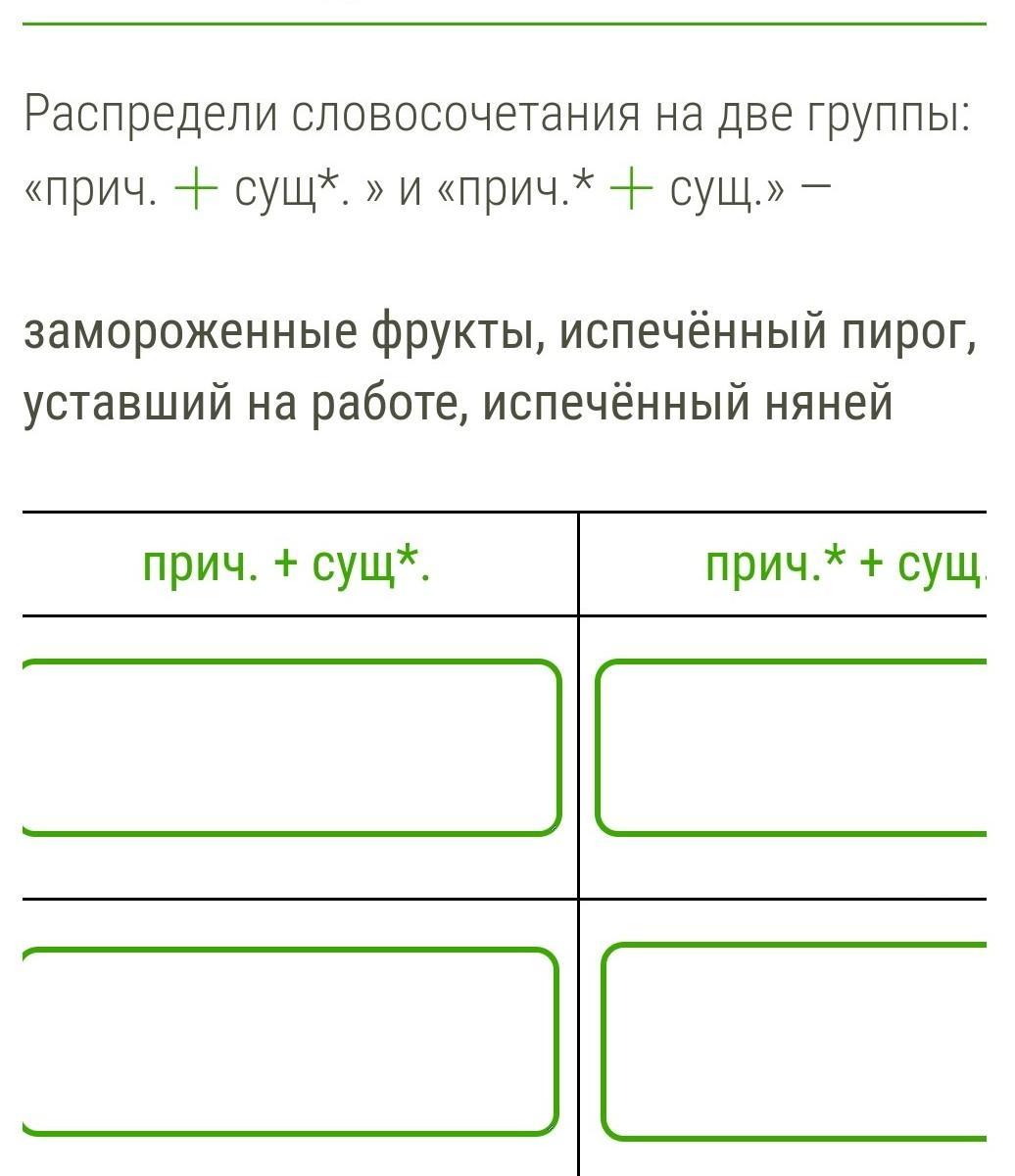 Разделить слова на группы необходимо по части речи главного слова в словосочетании. В первом случае вопрос задается от существительного, во втором -- от причастия.