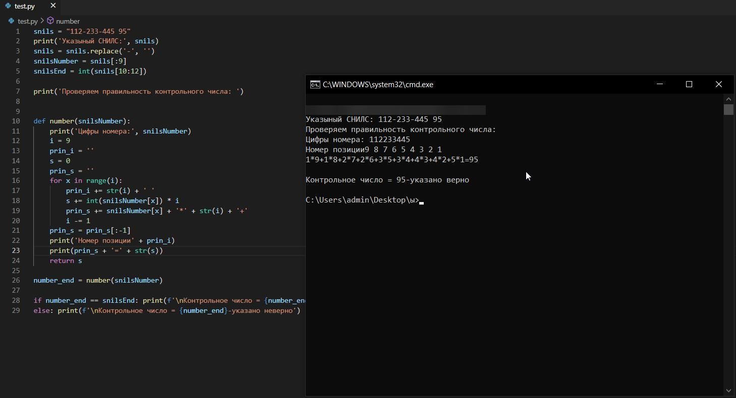 if number_end == snilsEnd: print(f'\nКонтрольное число = {number_end}-указано верно')