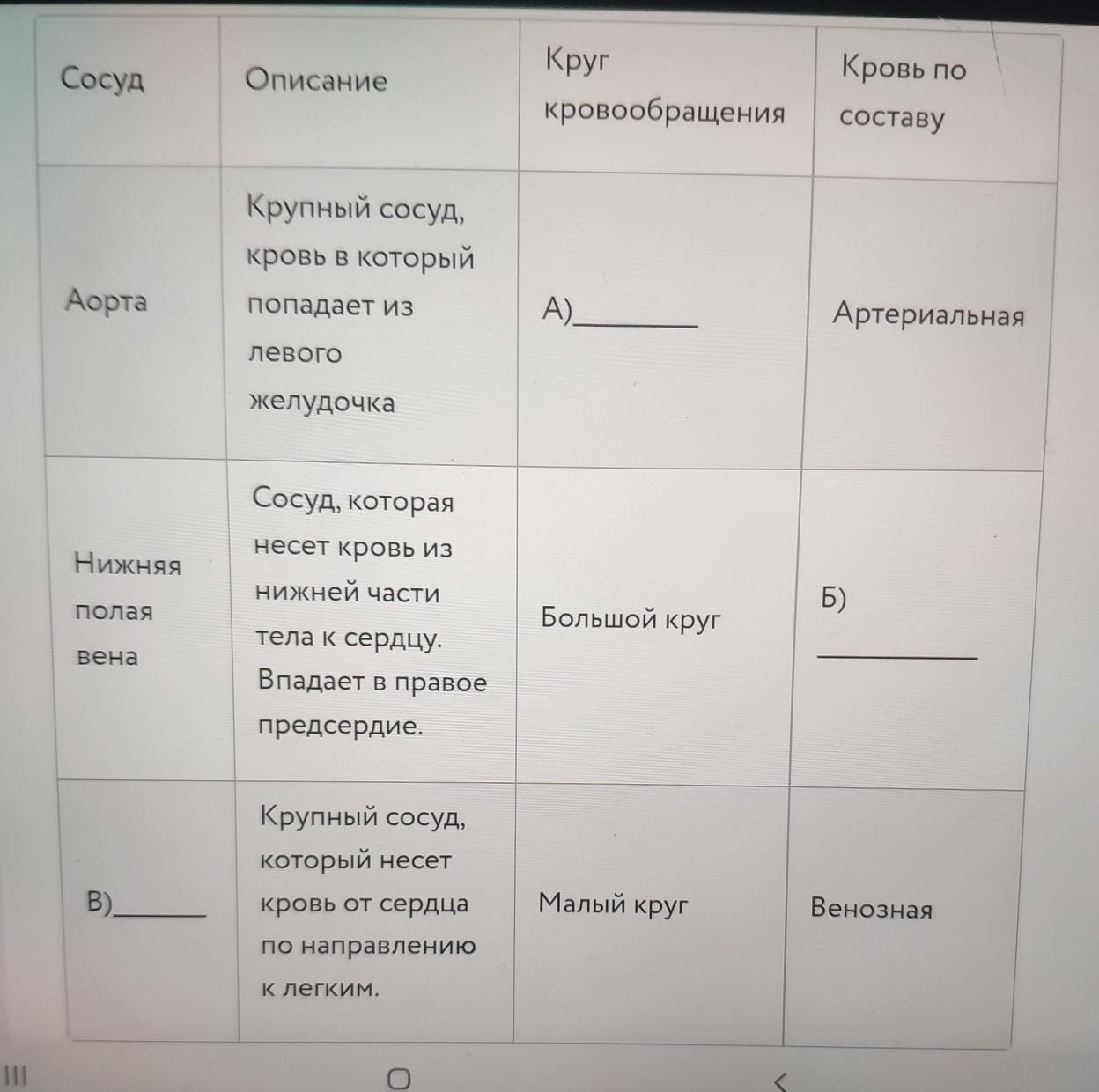 Рассмотрите таблицу с описанием кровеносных сосудов человека. Заполните пропуски, вписав в поле для ответа только номера выбранных вариантов без знаков препинания.