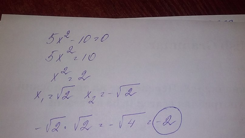 Решите уравнение 5х^2-10=0 Если корней несколько найдите их произведение.варианты ответа:1)-2;2)2;3)нет корней;И решений пожалуйсто
