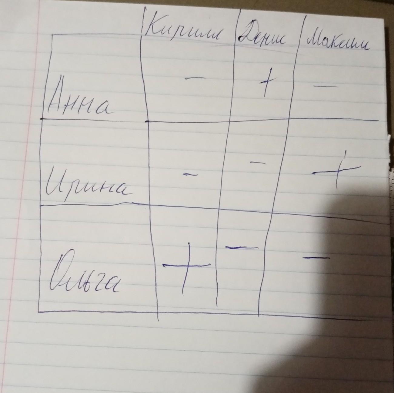 Каждая из них один раз сказала правду и один раз солгала. Как зовут мальчиков Анны, Ирины и Ольги? В ответе перечислите подряд без пробелов буквы, соответствующие именам мальчиков в указанном порядке имен их мам, например КМД.