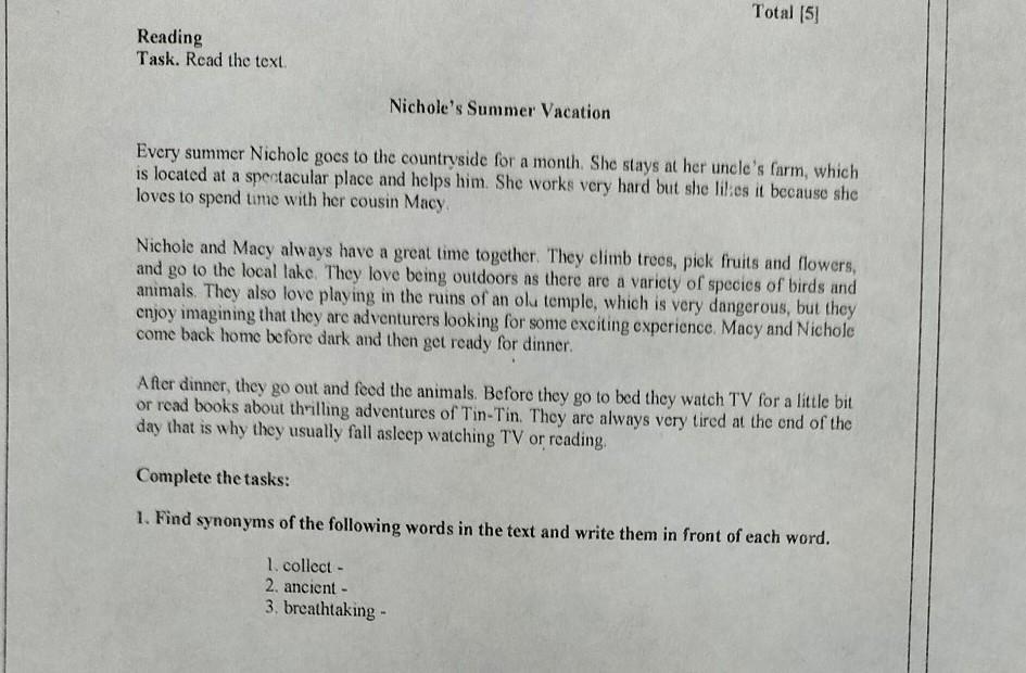 a Task. Read the text. Nichole's Summer Vacation Every summer Nichole goes to the countryside for a month. She stays at her uncle's farm, which is located at an amazing place and helps him. She works very hard but she likes it because she loves to spend time with her cousin Macy. Nichole and Macy always have a great time together. They climb trees, pick fruits and flowers, and go to the local lake. They love being outdoors as there are a variety of species of birds and animals. They also love playing in the ruins of an old temple, which is very dangerous, but they enjoy imagining that they are adventurers looking for some exciting experience. Macy and Nichole come back home before dark and then get ready for dinner. After dinner, they go out and feed the animals. Before they go to bed they watch TV for a little bit or read books about thrilling adventures of Tin-Tin. They are always very tired at the end of the day that is why they usually fall asleep watching TV or reading. Complete the tasks: 1. Find synonyms of the following words in the text and write them in front of each word. 1. breathtaking - 2. collect - 3. ancient- 2. Complete the sentences below, follow the sentence structure: foront. (мне не нужен перевод ,нужен ответ перевести я сама могу )