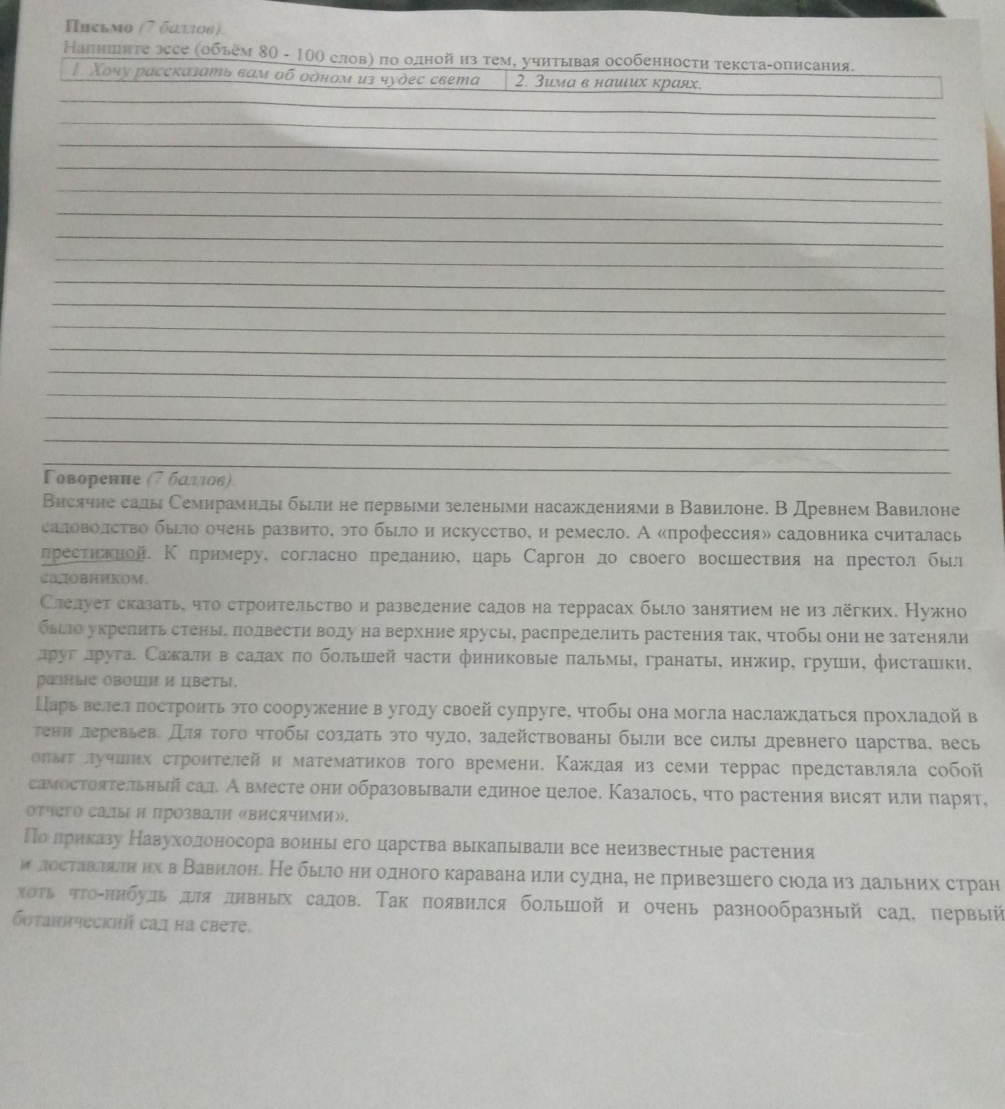 Напишите эссе (обьем 80-100 слов) по одной из тем, учитывая особенности текста-описания