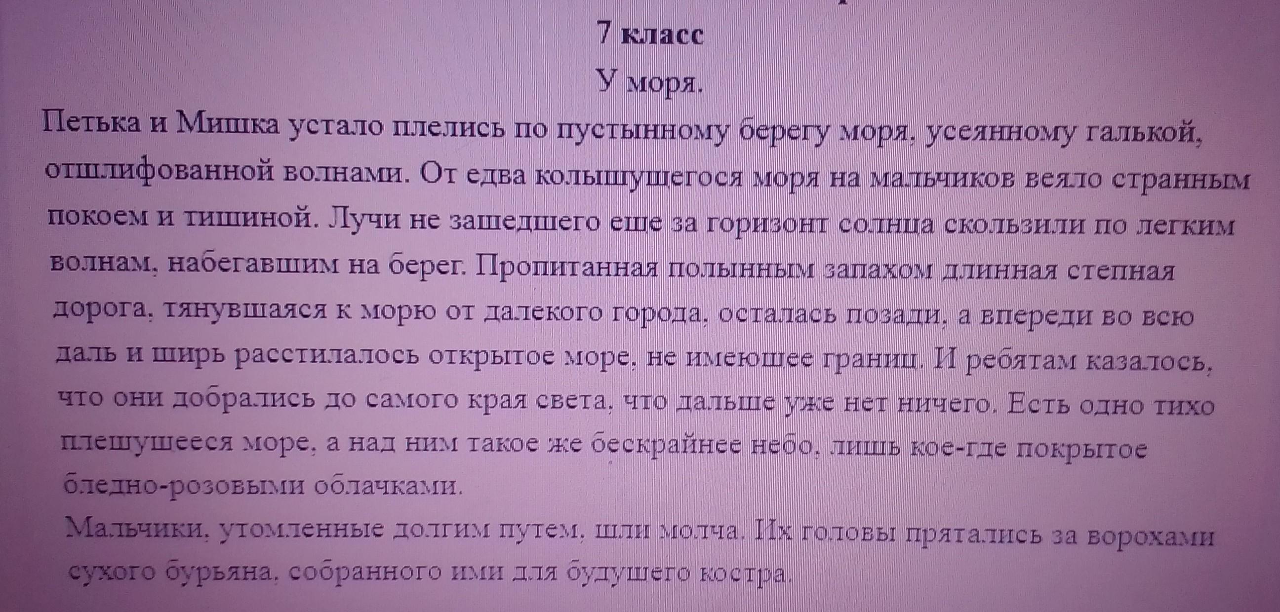 Пропитанная полынным запахом длинная степная дорога, тянувшаяся к морю от далёкого города, осталась позади, а впереди во всю даль и ширь расстилалось открытое море, не имеющее границ. И ребятам казалось, что они добрались до самого края света, что дальше уже нет ничего. Есть одно тихо плещущееся море, а над ним такое же бескрайнее небо, кое-где покрытое бледно-розовыми облачками.