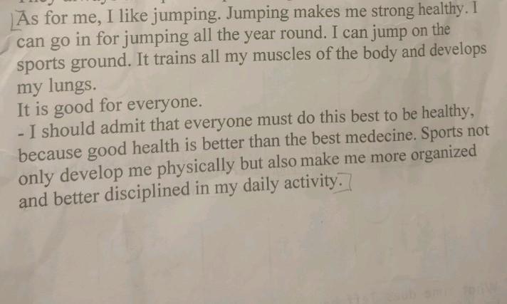 Эс фо ми, ай лайк джампинг. Джампинг мэйкс ми стронг хилзи. Ай кэн гоу ин фо джампинг ол зе ие раунд. Ай кэн джамп он зе спортс граунд. Ит трэйнс ол май маслс оф зе боди энд девелапс май ланъс.