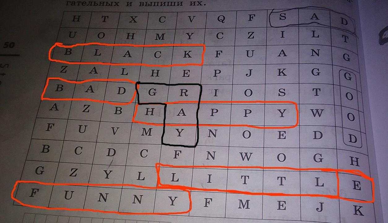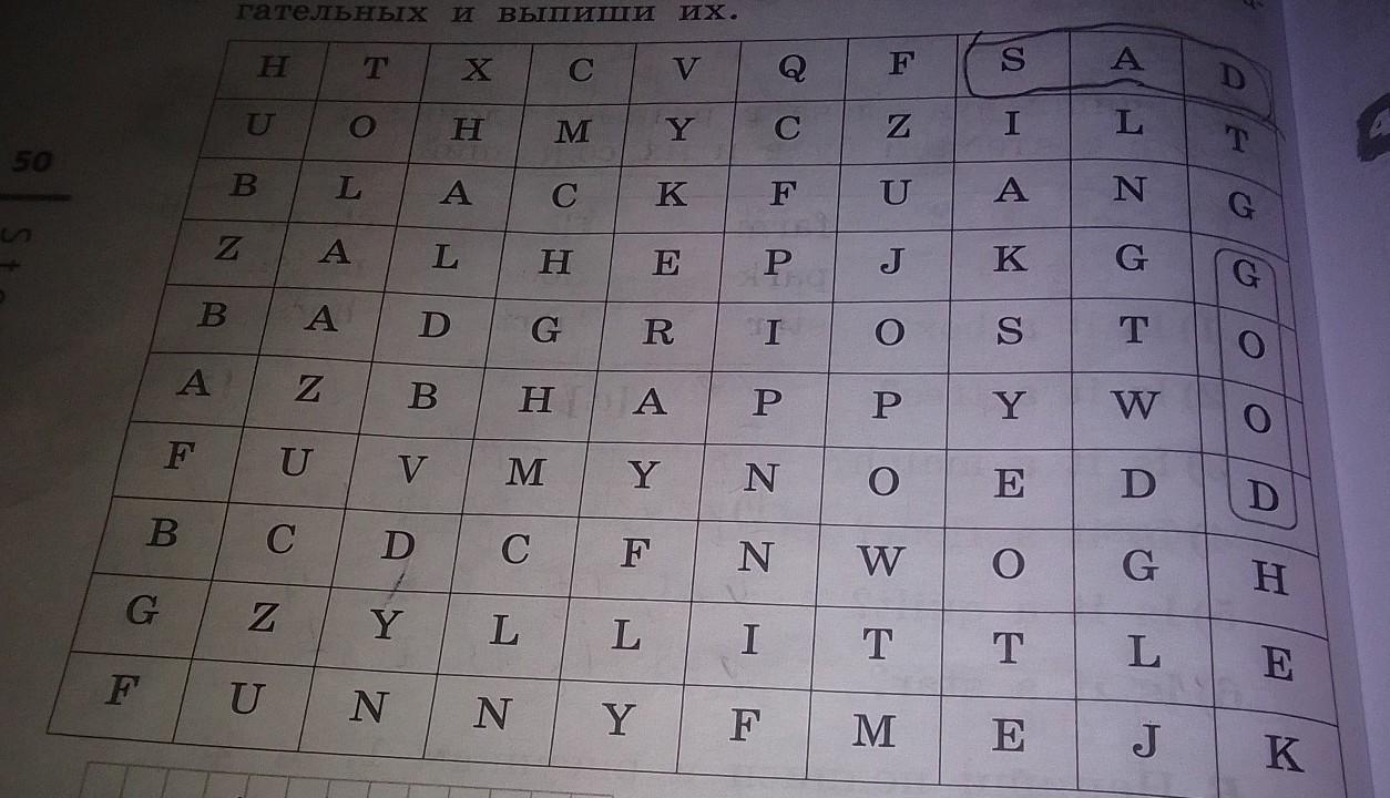 найди в этом квадрате ещё 6 английских прилагательных и выпиши и х.помогите пж.