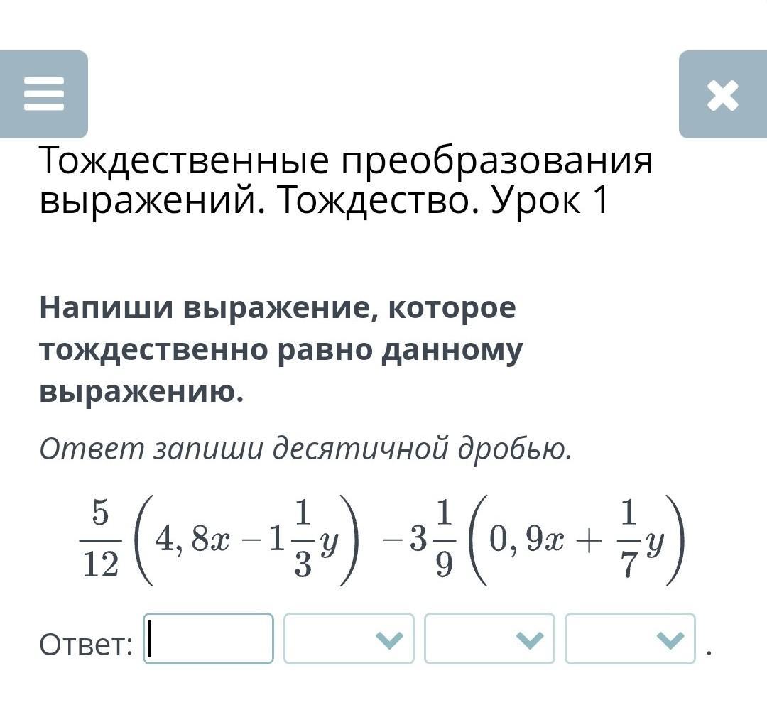 Тождественные преобразования выражений. Тождество. Урок 1 Напиши выражение, которое тождественно равно данному выражению. Ответ запиши десятичной дробью. Ответ: