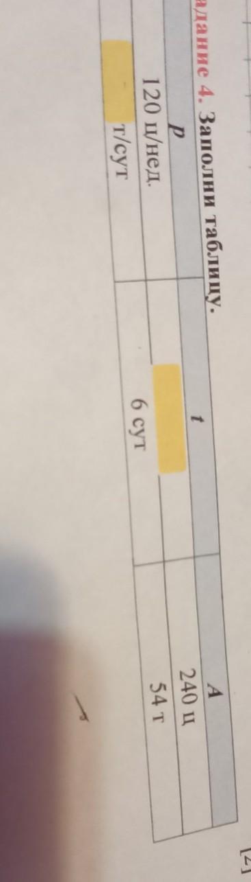 Задание 4. Заполни таблицу. р 120 ц/нед. т/сут А 240 ц 54 т 6 сут.ПЛМОГИИЕ ДАМ МНОГО БАЛООООВ!