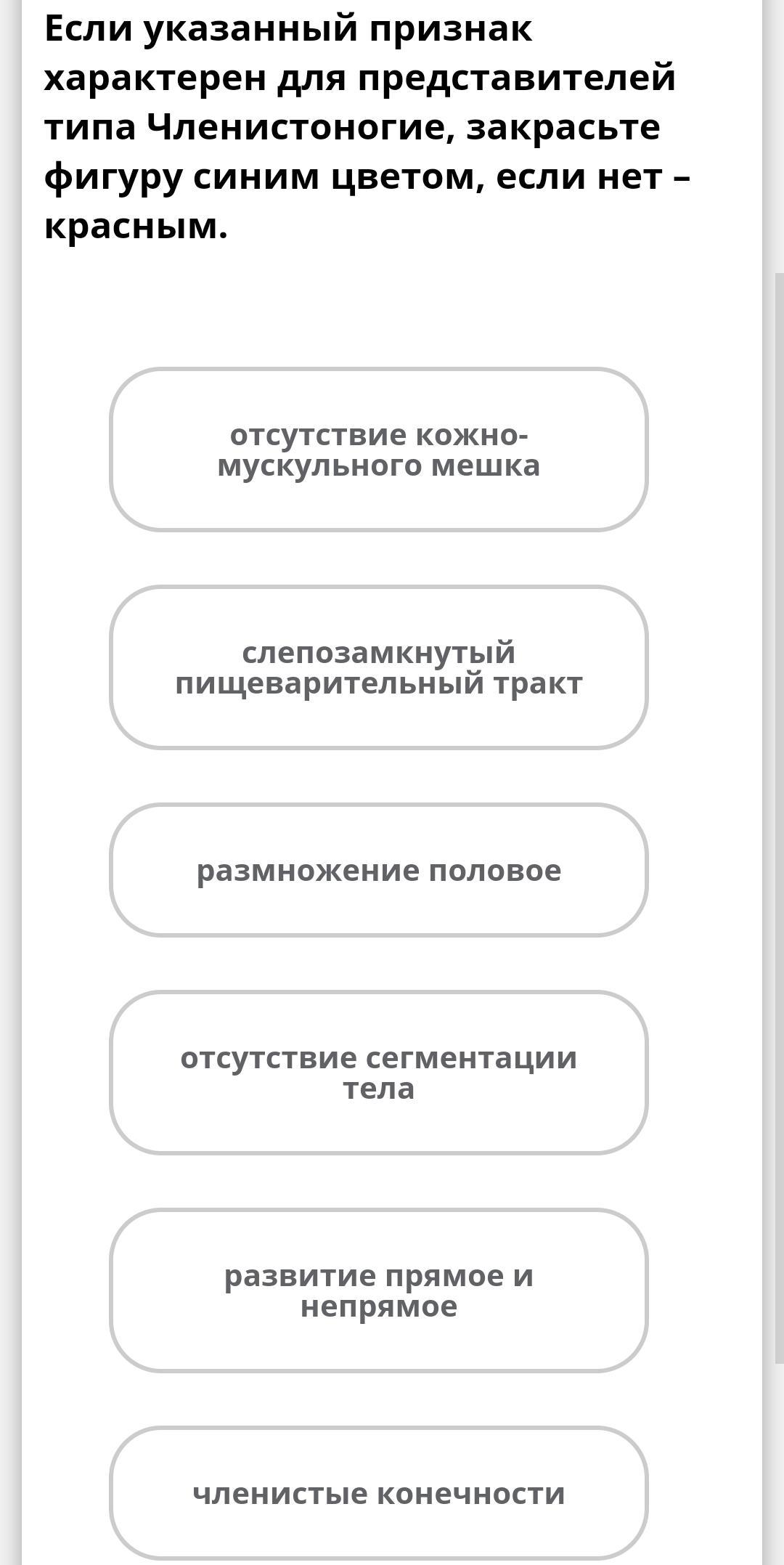 если указанный признак характерен для представителей типа членистоногие, закрасьте фигуру синим, а если нет то красным