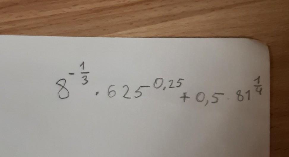 8⁻¹/³*625⁰.²⁵+0.5*81¹/⁴=2⁻¹*(5⁴)¹/⁴+0.5*(3⁴)¹/⁴=0.5*5+0.5*3=2.5+1.5=4
