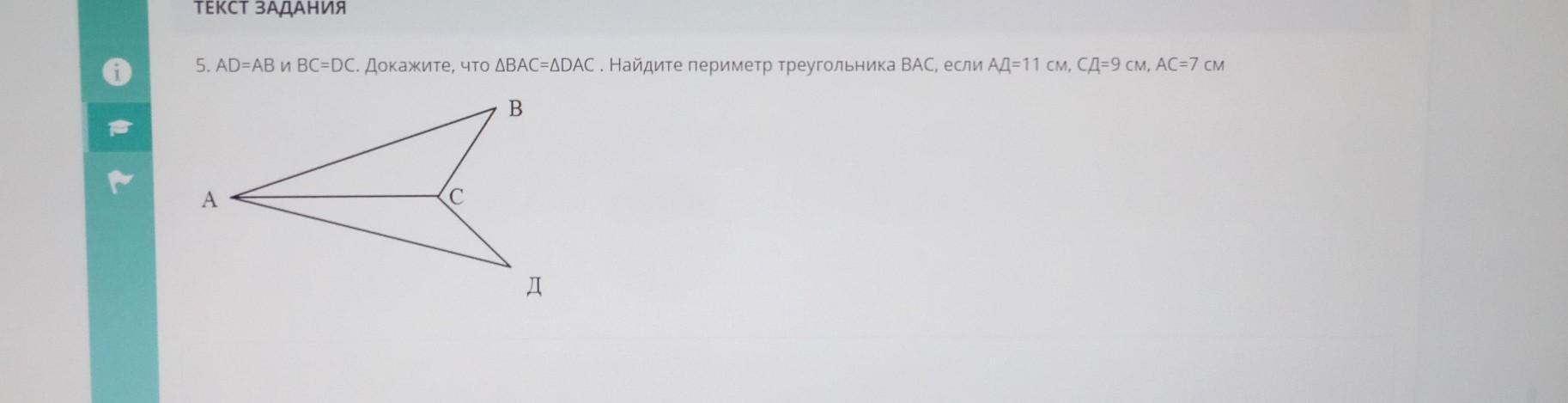 ТЕКСТ ЗАДАНИЯ 5. ADAB и BC-DC, Докажите, что ABAC - ADAC . Найдите периметр треугольника ВАС, если M=11 см, СД-9 см, AC-7 см В A д ПО ЖАЛУЙСТА СРОЧНО.
