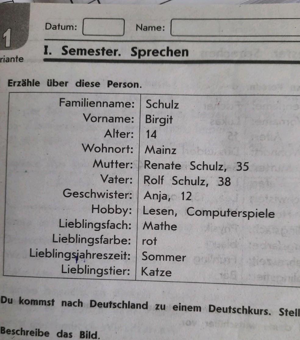 Das Mädchen heißt Birgit Schulz. Birgit ist 14 Jahre alt und wohnt in der Stadt Mainz. Die Mutter von Birgit heißt Renate und ist 35 Jahre alt. Der Vater heißt Rolf und ist drei Jahre älter, als seine Frau. Er ist 38 Jahre alt. Birgit hat eine Schwester. Die Schwester heißt Anja und ist 12 Jahre alt. Birgit hat zwei Hobbys: Lesen und Computerspiele. Ihr Lieblingsfach ist Mathe. Ihre Lieblingsfarbe ist rot. Birgit mag Sommer. Das ist ihre Lieblingsjahreszeit. Ihr Lieblingstier ist Katze.
