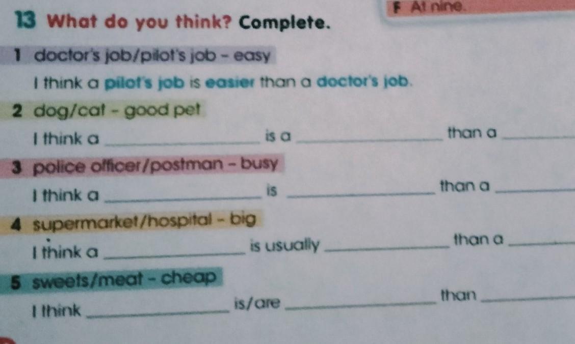 What do you think? Complete. doctor's job/pilot's job - easy I think a pilot's job is easier than a doctor's job. 2 dog/cat-good pet I think a I a than a 3 police officer/postman - busy I think a is than a 4 supermarket/hospital -big I think a is usually than a a sweets/meat - cheap Think Than is/are 40