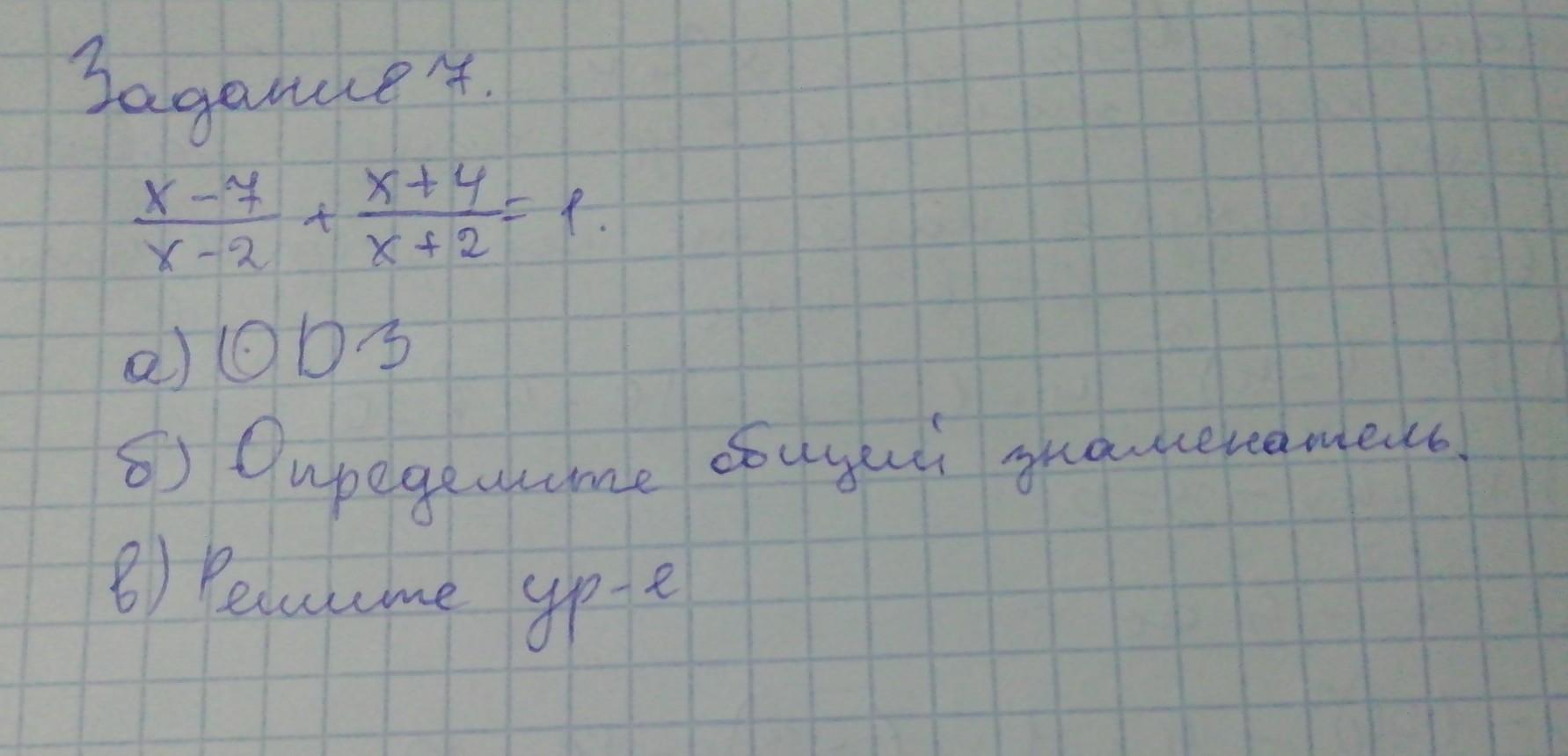 \displaystyle\bf\\\frac{x-7}{x-2}+ \frac{x+4}{x+2} =1\\\\1) \  \ ODZ \ : \  \ x\neq 2 \  \ ; \  \ x\neq -2\\\\2) \  \ (x-2)(x+2)\\\\3)\\\\\frac{x-7}{x-2}+ \frac{x+4}{x+2} =1\\\\\\\frac{x-7}{x-2}+ \frac{x+4}{x+2} -1=0\\\\\\\frac{(x-7)\cdot(x+2)+(x+4)\cdot(x-2)-(x-2)\cdot(x+2)}{(x-2)(x+2)} =0\\\\\\\frac{x^{2} +2x-7x-14+x^{2} -2x+4x-8-x^{2} +4}{(x-2)(x+2)} =0\\\\\\\frac{x^{2} -3x-18}{(x-2)(x+2)} =0\\\\\\x^{2} -3x-18=0\\\\D=(-3)^{2} -4\cdot(-18)=9+72=81=9^{2}