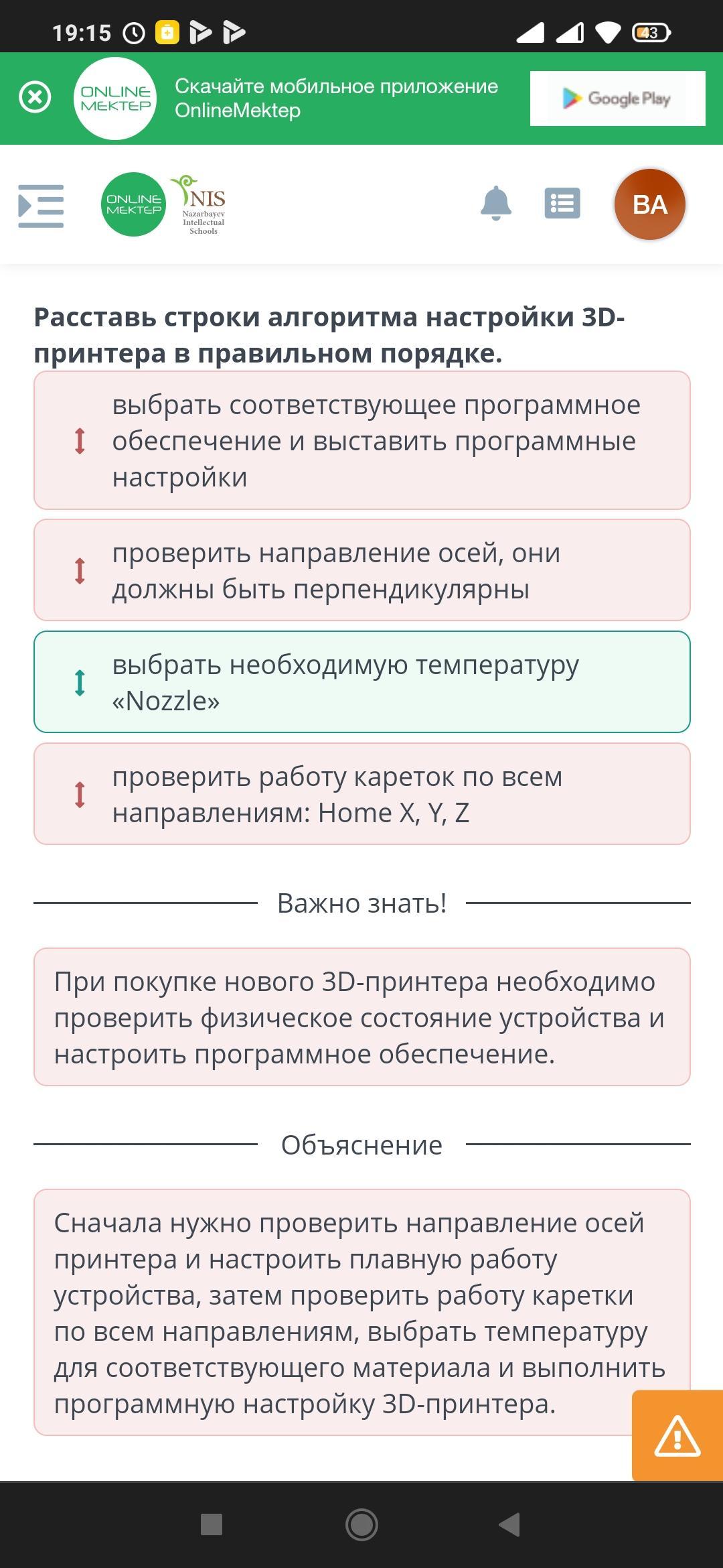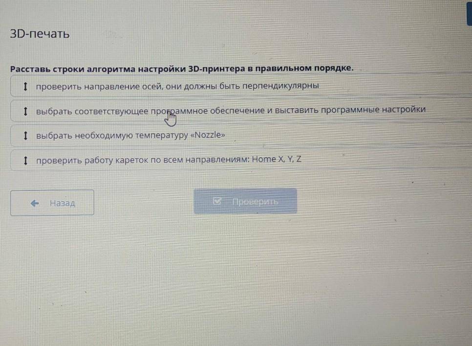 3D-печать Расставь строки алгоритма настройки 3D-принтера в правильном порядке. І проверить направление осей, они должны быть перпендикулярны 1 и І выбрать соответствующее пропраммное обеспечение и выставить программные настройки І выбрать необходимую температуру «Nozzle» І проверить работу кареток по всем направлениям: Home X, Y, Z Назад