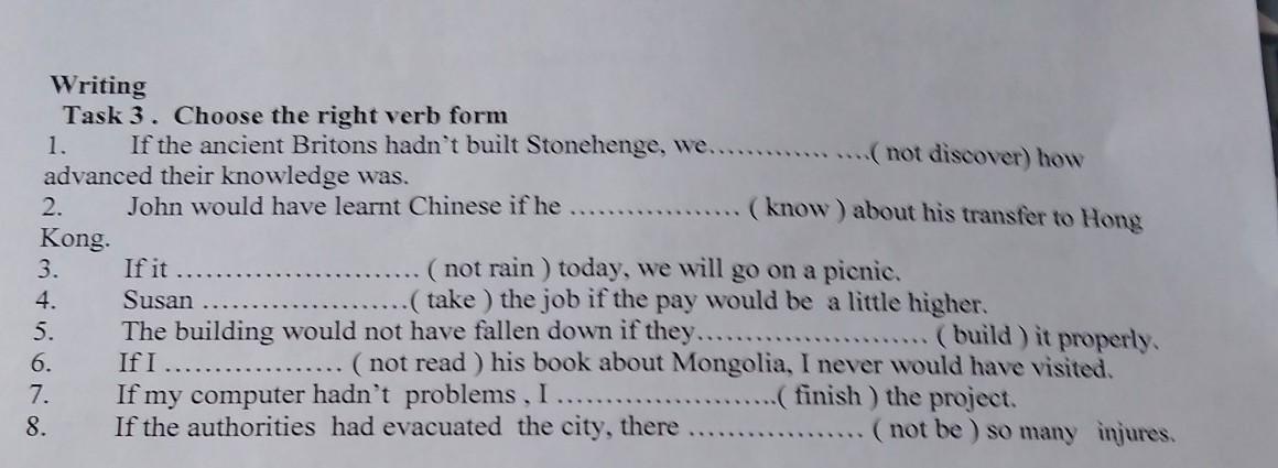 1 wouldn't have discovered 2 had known 3 doesn't rain 4 would take 5 had built 6 hadn't read 7 would finish 8 wouldn't have been
