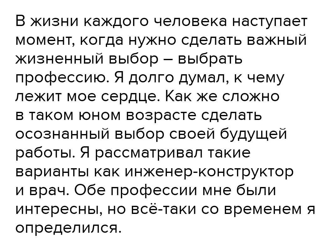 Профессия – это осознанно избранное русло, в которое ты будешь вкладывать много сил и времени. У каждого человека есть своя профессия, то есть у каждого есть своя дорога которую он выбрал и идёт по ней трудясь и зарабатывая. Профессия часто зависит от хобби человека.Если человек увлекается этим делом, то в будущем его желание исполнит его профессия. Но бывает когда человек не хотя выбирает свою профессию. Это конечно плохо, но жизнь показывает кем ты должен стать.