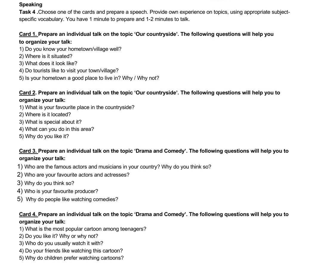 спикинг задание легкое выбираешь одну из карточек передводишь вопросы,идешь к училке и говоришь ответы на эти вопросы на англиском