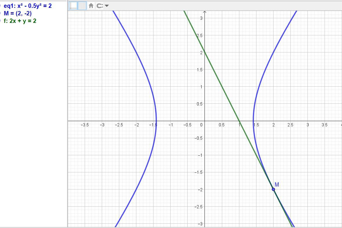 Уравнение касательной, проведённой в точке М(2,-2) к гиперболе x^2/2 - y^2/4 = 1 имеет вид y=kx+b. Найти k и b?