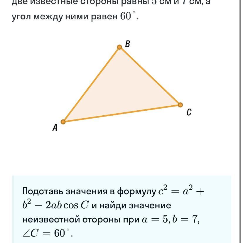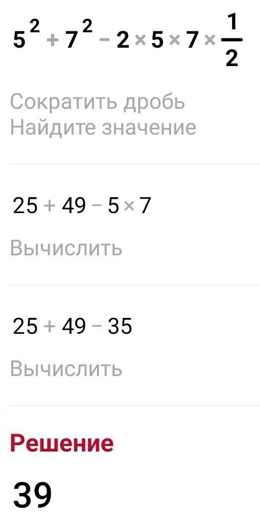 c² = a² + b² - 2ab cosC = 5² + 7² - 2 × 5 × 7 × cos60° = 25 + 49 - 70 × ½ = 74 - 35 = 39