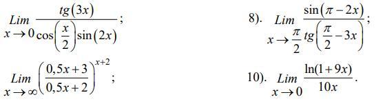8) Непосредственная подстановка значения x=π/2 в данное выражение приводит к неопределённости вида 0/0. Полагая π-2*x=t, получаем выражение sin(t)//tg(3*t/2-π)=sin(t)/tg(3*t/2) И так как при x⇒π/2 t⇒0, то, заменяя sin(t) на t и tg(3*t/2) на 3*t/2, получаем выражение t/(3*t/2)=2/3. Его предел, очевидно, равен 2/3. Ответ: 2/3.