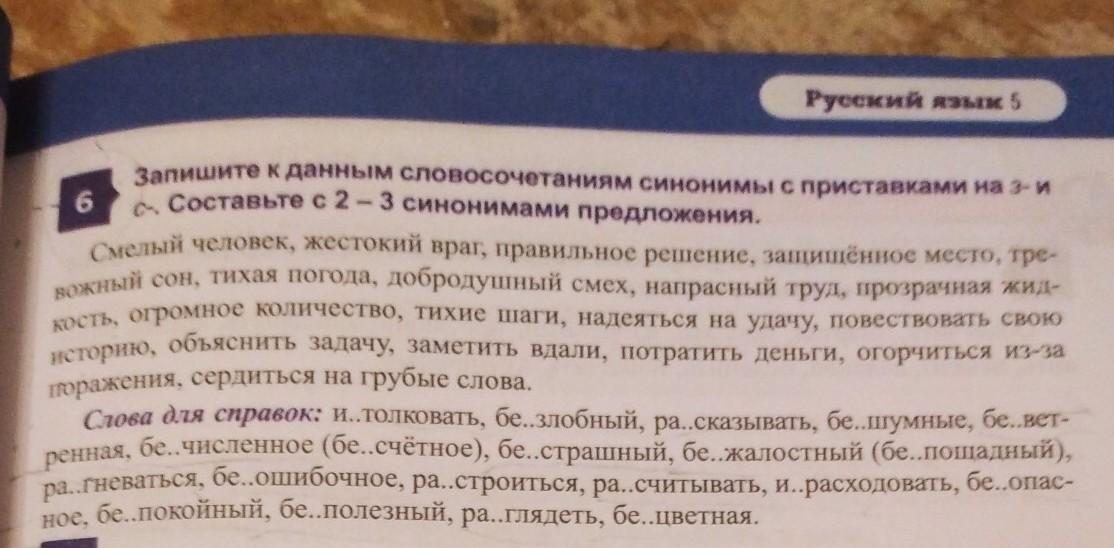 6 Запишите к данным словосочетаниям Синонимы с приставками на з- и с. Составьте с 2-3 синонимами предложения. Смелый человек, жестокий враг, правильное решение, защищённое место, тре- вожный сон, тихая погода, добродушный смех, напрасный труд, прозрачная жид- кость, огромное количество, тихие шаги, надеяться на удачу, повествовать свою историю, объяснить задачу, заметить вдали, потратить деньги, огорчиться из-за поражения, сердиться на грубые слова. Слова для справок: и..толковать, бе..злобный, ра..сказывать, бе..шумные, бе..вет- ренная, бе..численное (бе..счётное), бе..страшный, бе..жалостный (бе..пощадный), ра..гневаться, бе..ошибочное, ра..строиться, ра..считывать, и..расходовать, бе..опас- ное, бе..покойный, бе..полезный, ра..Глядеть, бе..цветная.