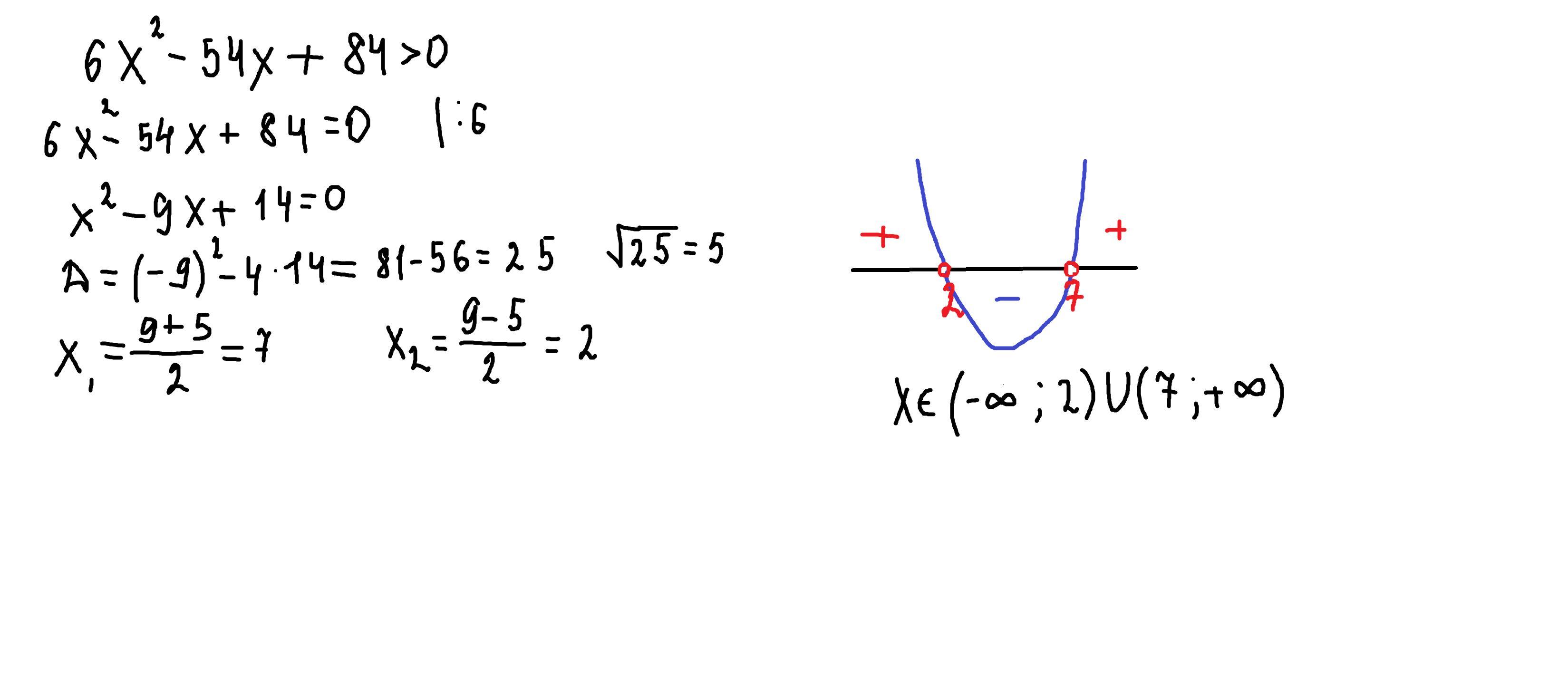 сокращаем на 6,находим дискриминант ,Д>0,значит 2 корня.Отмечаем их на прямой и рисуем схематически параболу.Т.к а>0,то ветви направлены вверх.Т.к неравенство >0,то записываем промежутки где ветви параболы выше прямой.